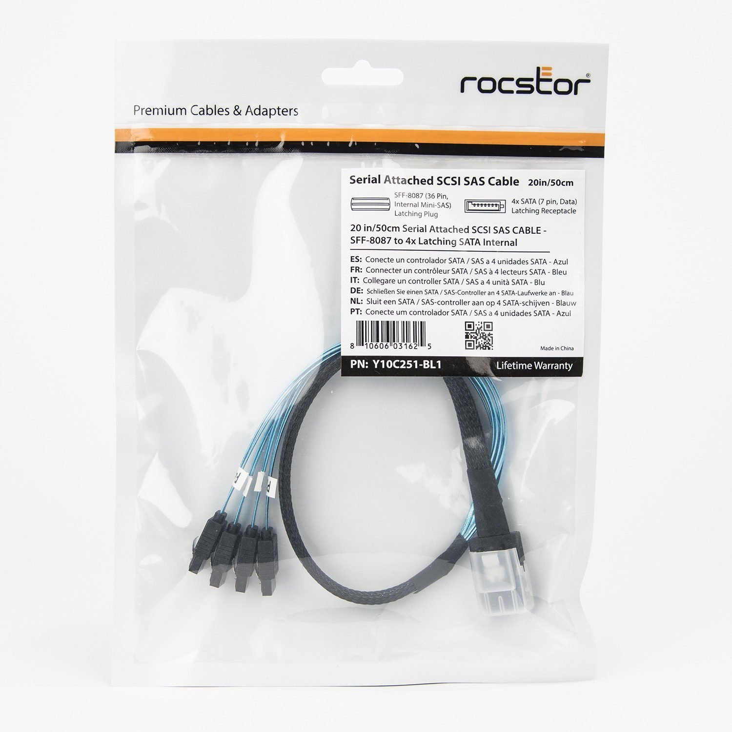 Rocstor 20in/50cm Serial Attached SCSI SAS Cable-SFF-8087 to 4x SATA Latching