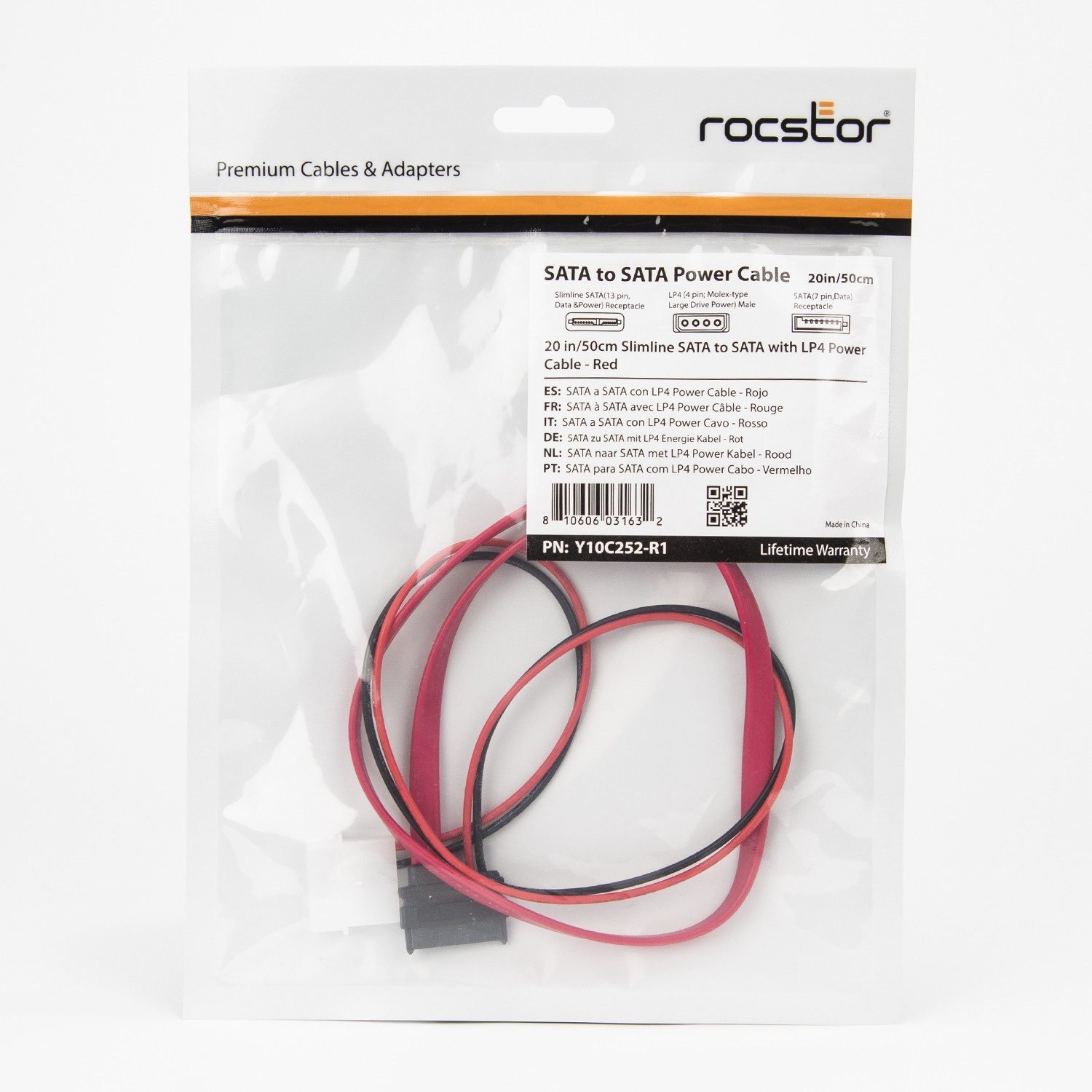 Rocstor Premium 20in / 50 cm Slimline SATA to SATA with LP4 Power Cable Adapter allows you to connect a Slimline SATA drive to a standard SATA Motherboard connector. The connector on one end has a SATA data receptacle and a Molex LP4 power connection, and on the other end, a Slimline Serial ATA receptacle. An effective solution to connect a slim SATA drive to the motherboard of a computer that does not have a Slimline connection. Supports SATA 3.0 bandwidths up to 6Gbps when using SATA 3.0 drives that are compliant. Backed by Rocstor Lifetime Warranty.