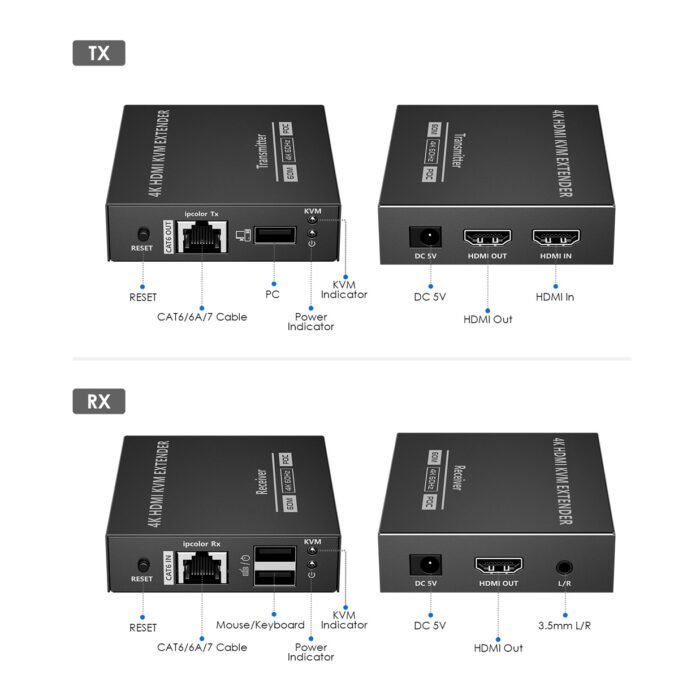 Extend 4K@60Hz signals up to 197 feet (60 meters) over CAT6, CAT6a, or CAT7 Ethernet cables with uncompromising quality. The integrated KVM functionality allows users to control remote systems using a keyboard and mouse, making it ideal for professional workstations, conference rooms, and interactive setups. With HDMI loop-out on the transmitter, local monitoring is also possible, while the receiver provides a 3.5mm stereo audio output for enhanced audio flexibility.