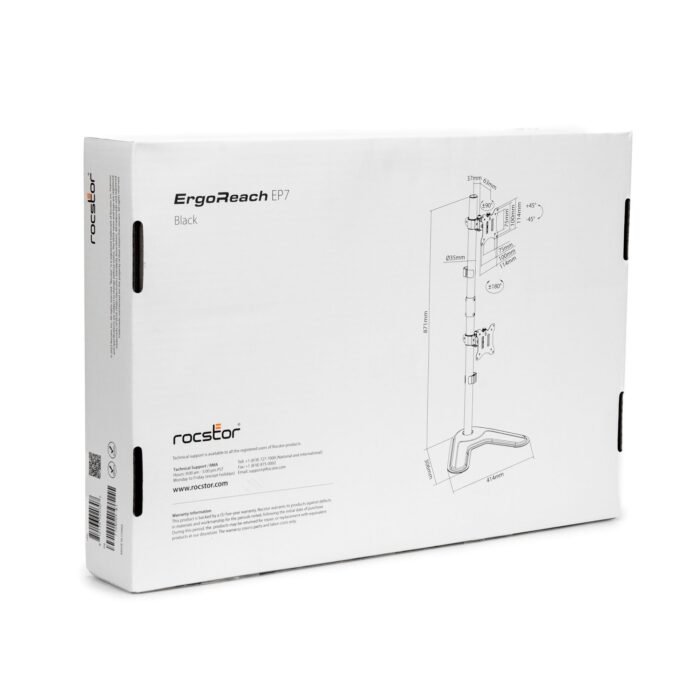 The detachable VESA plate design and individual height adjustment simplifies the monitor installation process and allows you to achieve precise monitor alignment. Seamless switching between portrait and landscape orientations allows you to accommodate diverse viewing preferences and enhance the overall workflow. The integrated cable clip management system ensures no cable disrupts the aesthetic of your workspace. Crafted from a combination of steel, aluminum, and plastic and featuring a powder coating finish, this stand represents unwavering stability and longevity. Rocstor EP7 is not merely a stand, it’s a commitment to refined efficiency and productivity. This ErgoReach EP7 Premium Dual Screen Vertical Monitor Stand is backed by Rocstor’s 5-year warranty and lifetime free technical support.