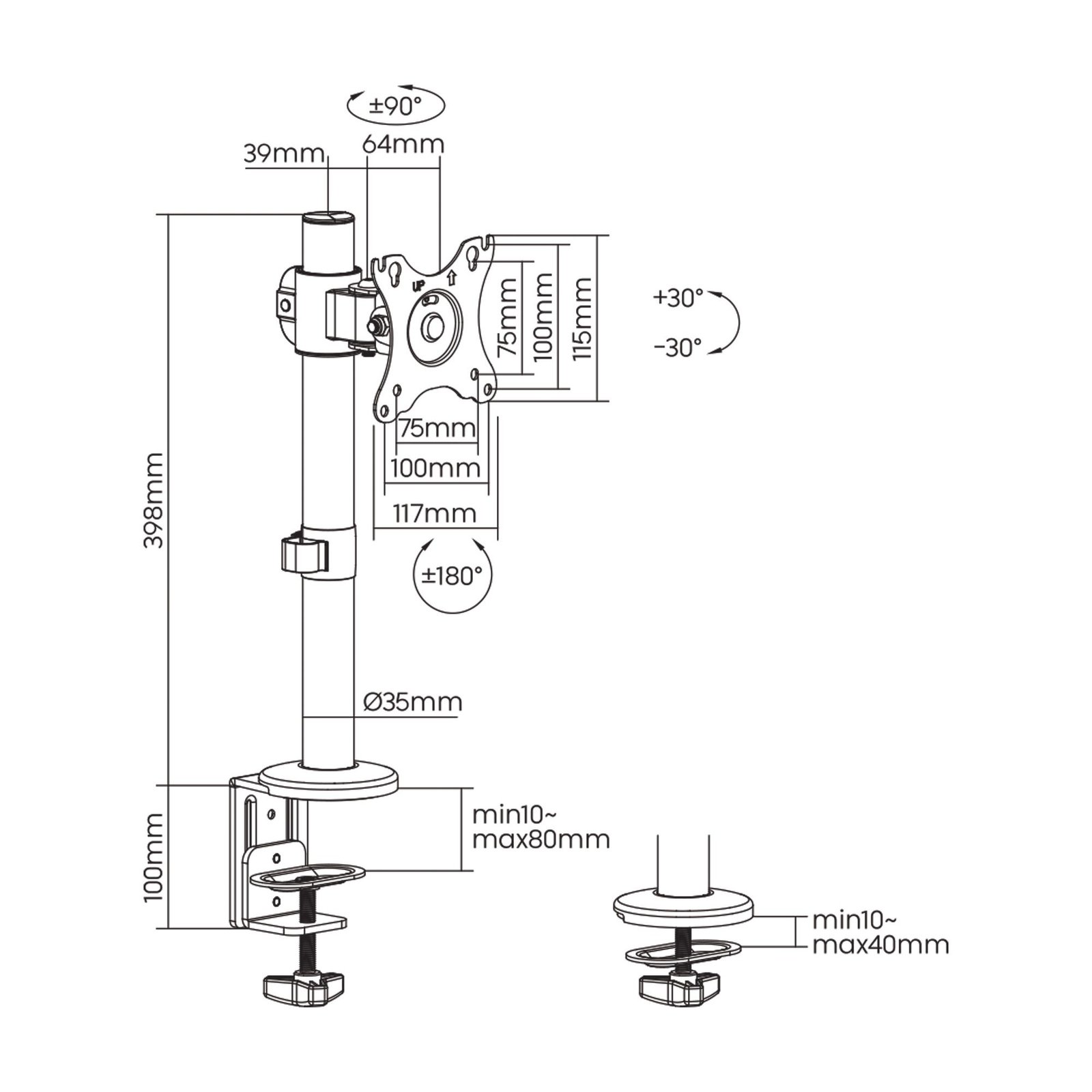 • Supports a single display up to 34″ with a weight capacity of 8kg (17.6lbs) per screen