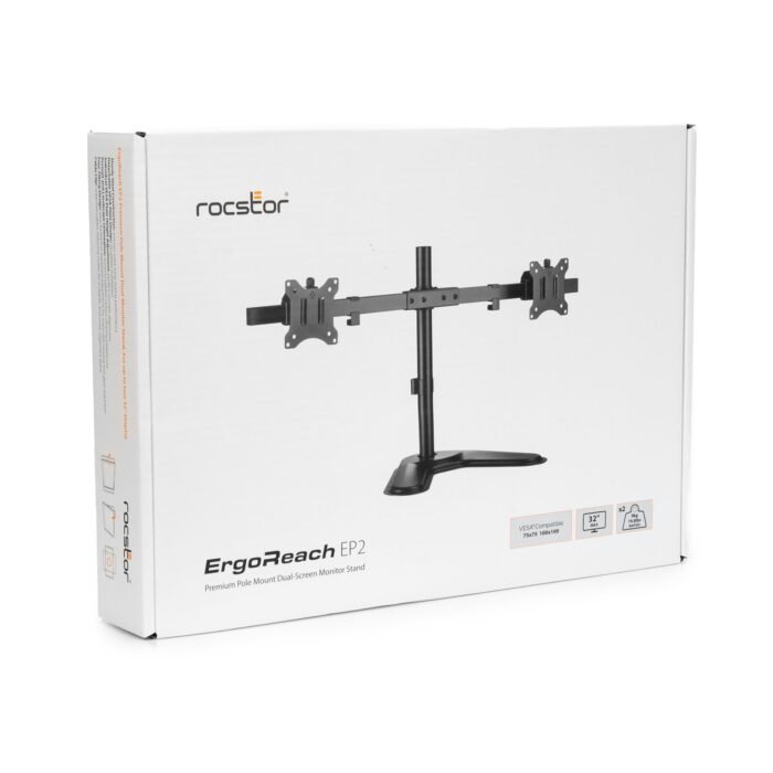 ErgoReach EP2 Premium Dual-Screen Monitor Stand is an ideal solution for creating an organized and efficient workspace. Designed to accommodate up to two 32-inch displays, this heavy-duty pole mount free-standing dual monitor stand is perfect for users who require multiple screens to enhance productivity. With a weight capacity of 9kg (19.8lbs) per screen and compatibility with VESA 75x75mm and 100x100mm, it easily supports monitors ranging from 17 to 32 inches. The ErgoReach EP2 features quick-release VESA plates and individual height adjustment, ensuring precise alignment of your monitors for optimal viewing comfort. Its ergonomic tilt range of ±45° and swivel range of ±15° provide flexibility while reducing eye strain and neck discomfort, promoting a more ergonomic work posture.