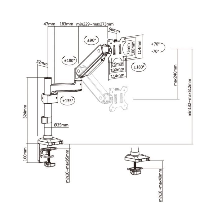 • Supports up to 34″ displays with a weight capacity of 22lbs per screen