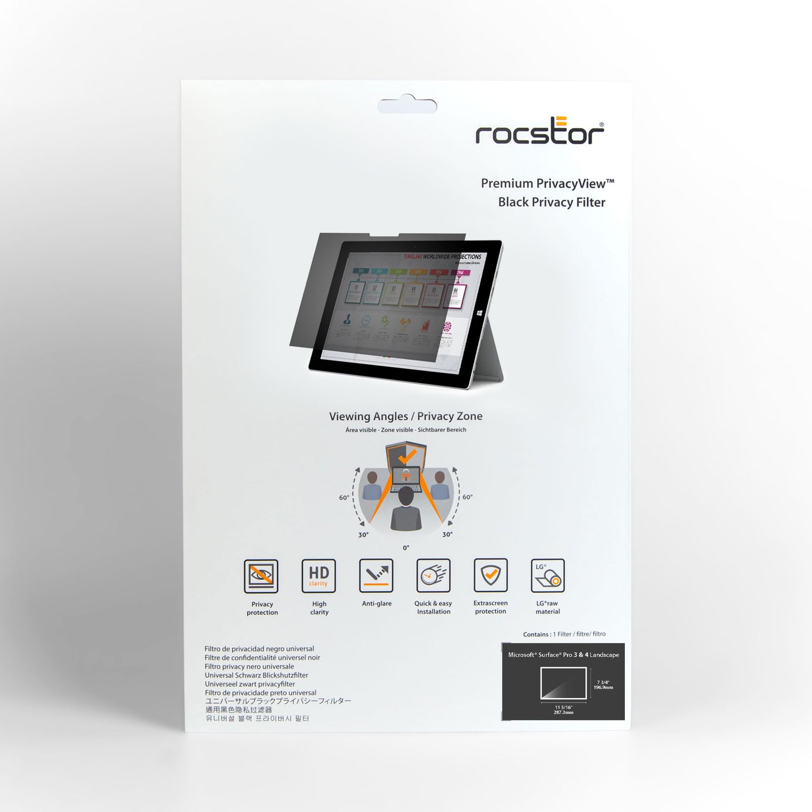 The Rocstor PrivacyView™ premium privacy and protection filters provide a whole new level of security and privacy for your Microsoft® Surface® Pro 3/4 series. Rocstor Microsoft® Surface® Pro 12.3” filter with 13:2 aspect ratio privacy screen delivers the most advanced Microlouver Privacy Technology. Rocstor privacy filters can be used either in Glossy or Matte sides. The PrivacyView™ filters also protect from visual hackers and at the same time provides an amazing clear image for your direct view. Rocstor’s advanced Privacy technology protects your information with tiny vertical blinds that are built on the surface of the filter which narrows the viewing angle. The information on your display would be only visible directly in front of the display up to 30 degrees away from the center of the screen and the sides are blacked out from outside of 60-degree viewing angle. Rocstor filters reduce display blue light by 37%.