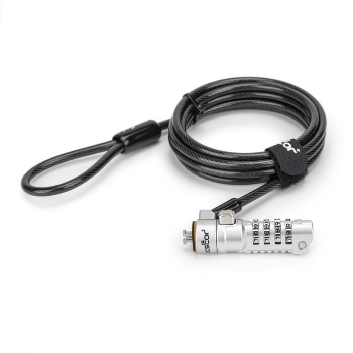 The Rocstor Rocbolt N19 Series Premium 4-Digit Resettable Combination Cable Lock is designed to provide robust security for HP and Dell devices with Nano-shaped security slots. Built with a slim yet durable lock head, this heavy-duty security solution ensures a secure and tamper-resistant connection without adding bulk. Featuring a resettable 4-digit combination, this lock delivers keyless security, making it an ideal choice for businesses, schools, and high-traffic environments where safeguarding valuable assets is a priority.
