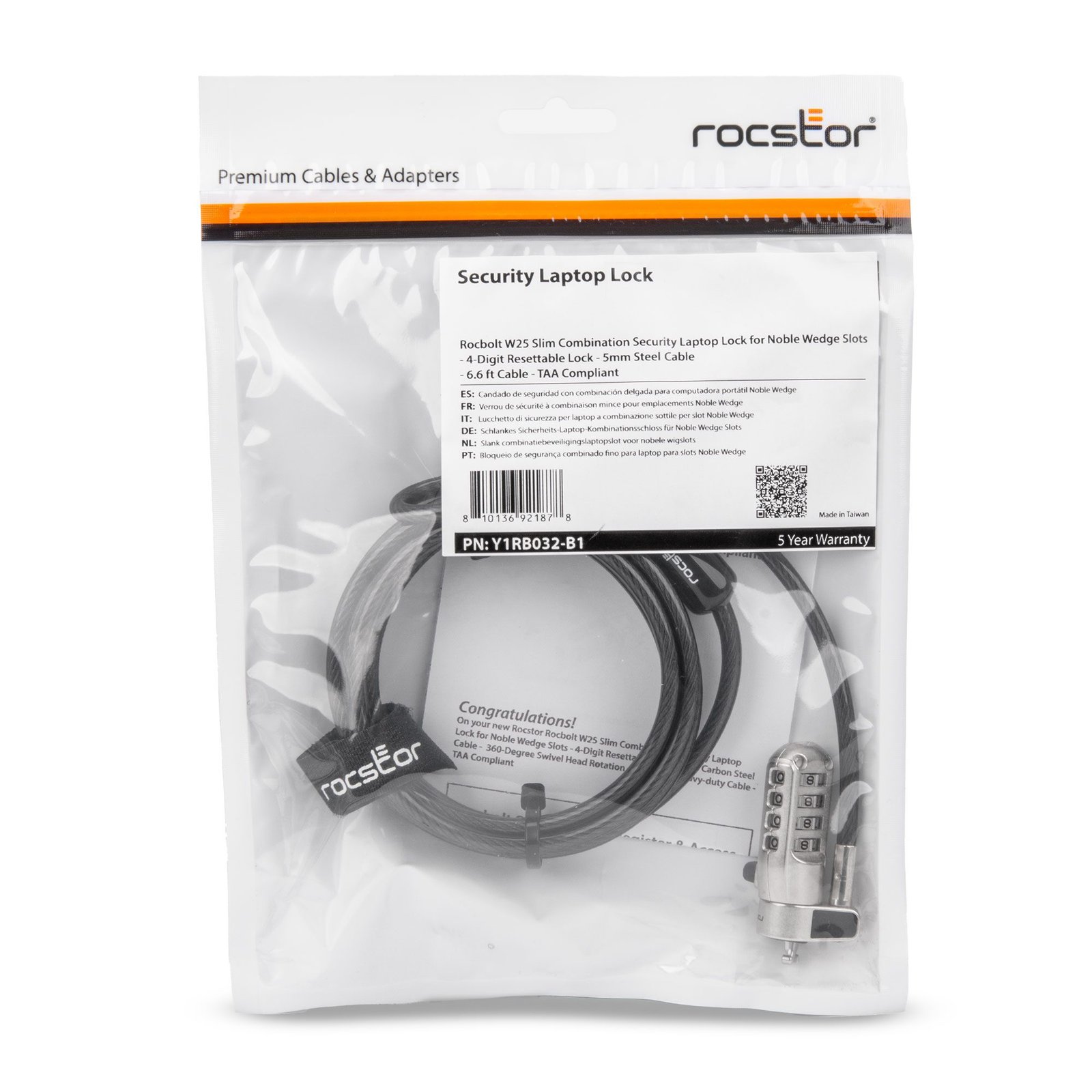 Perfect for securing devices in offices, schools, and other public areas, the Rocbolt W25 Slim Combination Security Laptop Lock offers exceptional asset security and helps reduce theft. These locks are tested for torque/pull, foreign implements, lock lifecycle, corrosion, strength, and other environmental conditions. Nearly thousands of notebooks and other portable devices are stolen every day – protect your valuable assets by using the 6.6 ft heavy-duty Rocbolt cable combination lock system. Backed by Rocstor 5-year limited warranty and lifetime technical support.