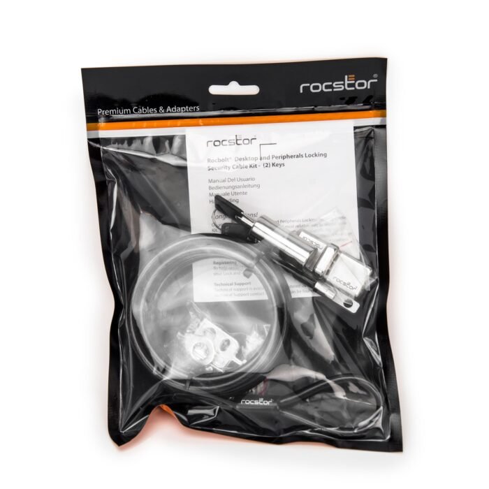 Protect your valuable equipment with the Rocstor Rocbolt Premium Heavy-Duty Locking Kit, an all-in-one security solution designed to safeguard desktops, laptops, monitors, and other peripherals in offices, schools, and public spaces. Engineered for superior protection, this advanced system features an 8-foot (2.5m) high-carbon, cut-resistant steel cable with a 6mm diameter, providing exceptional resistance against theft and unauthorized access. The keyed lock system ensures reliable security, while the integrated cable trap secures wired peripherals such as keyboards and mice.
