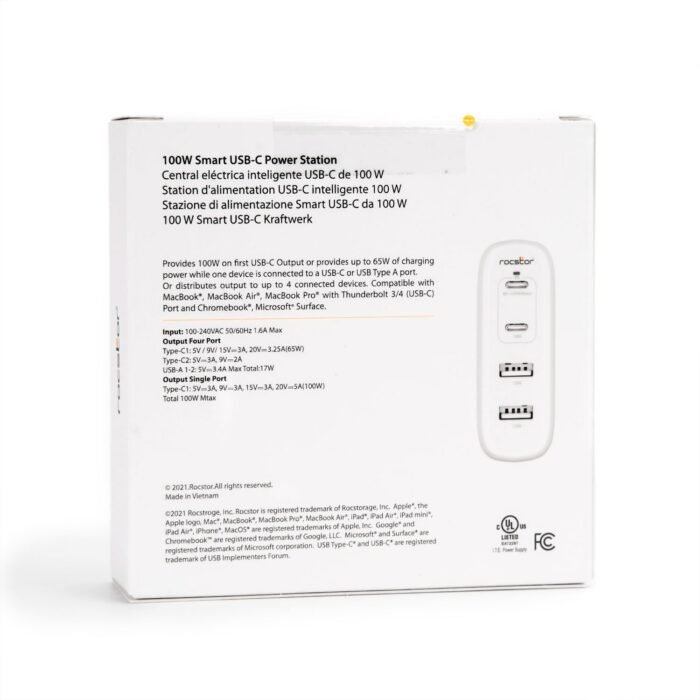 This versatile smart power adapter can also charge any HP®, Lenovo®, Dell and Chromebook™ devices that utilize up to 100W power. Rocstor’s 100W Smart power adapter automatically adjusts to your device power requirement up to 100W. This travel and compact charger is rugged, light and it is able to charge laptops, iPad®, tablets, cellular phone, earphones and everything else with a USB power input up to 100W. You are able to take advantage of this fast power adapter to charge your Apple® iPhone®, Samsung Galaxy®, or Google® Pixel® phone and tablets. With only 9.28 Ounces (263 g), this slim and compact design charger measures only 3.17” x 3.15” x 1.16” (80.5 x 80 x 29.5 mm) and features a foldable plug. The Rocstor 100W has the latest GaN (Gallium Nitride) Charging Technology and it holds the UL, FCC/CE, & VI Entergy Efficent certifications for the máximum safety protocols. It has a more efficient current transfer, which translates to less power loss to heat. Backed by Rocstor’s 1-year warranty and lifetime technical phone support.