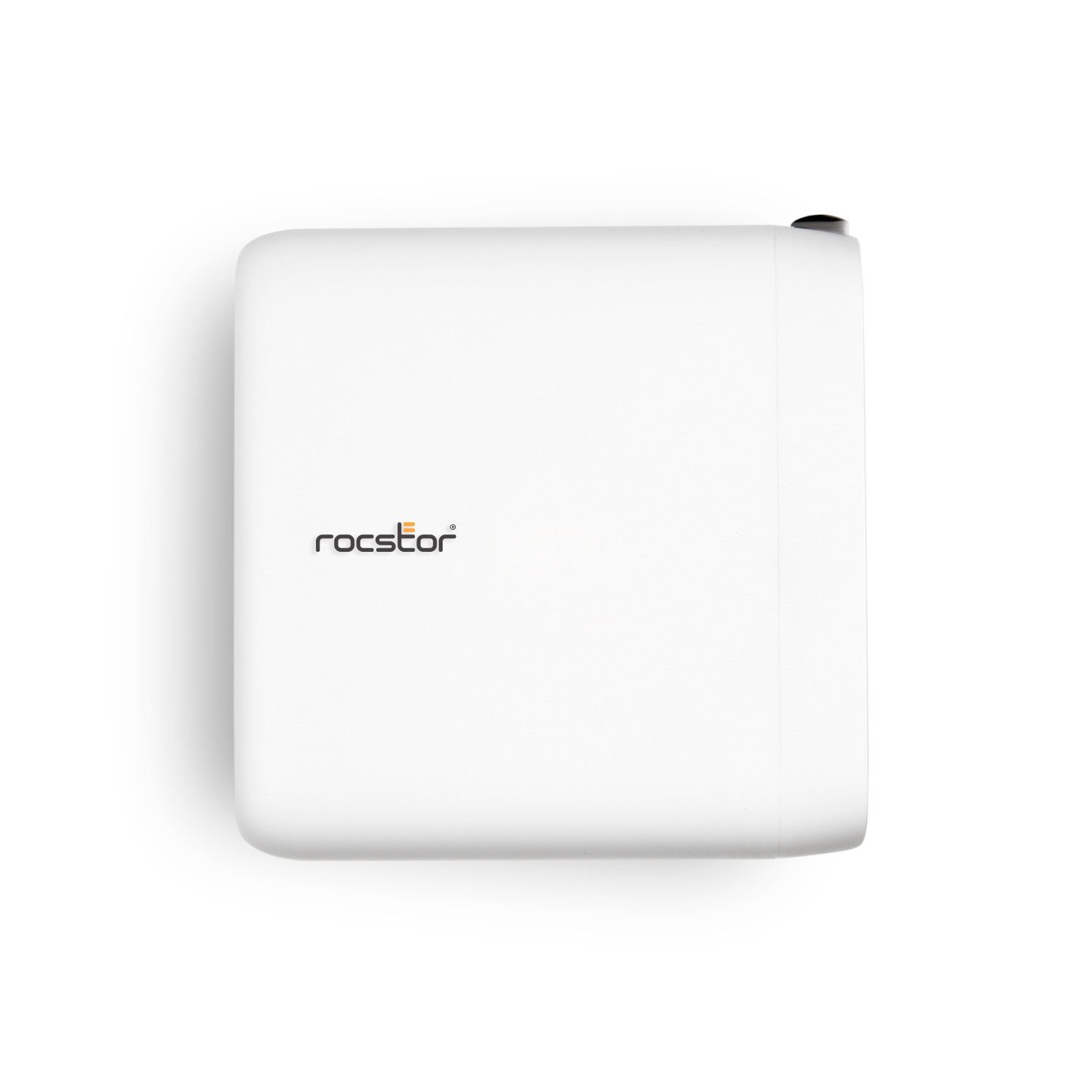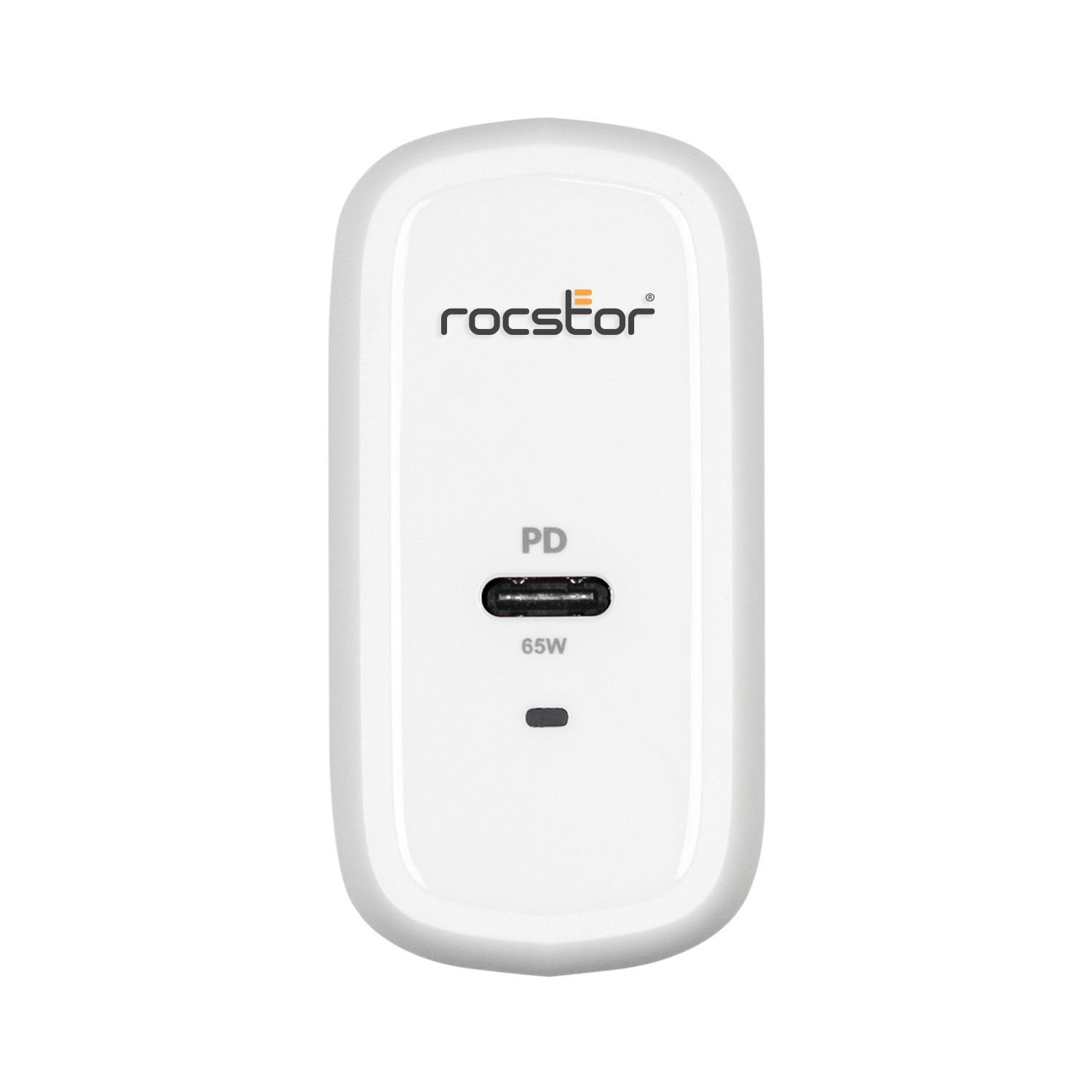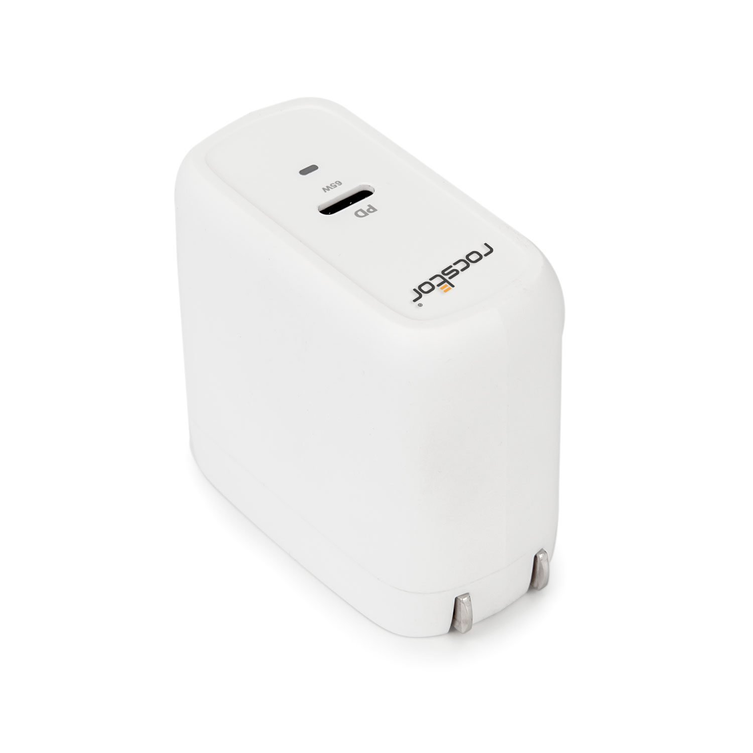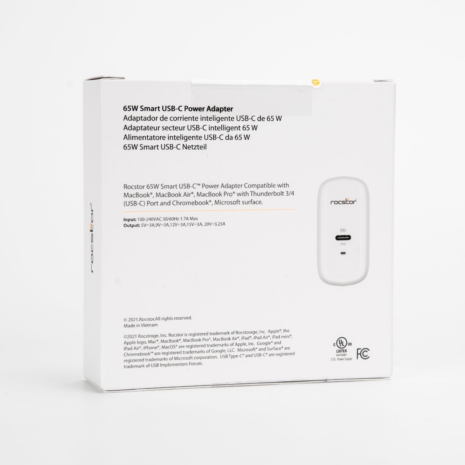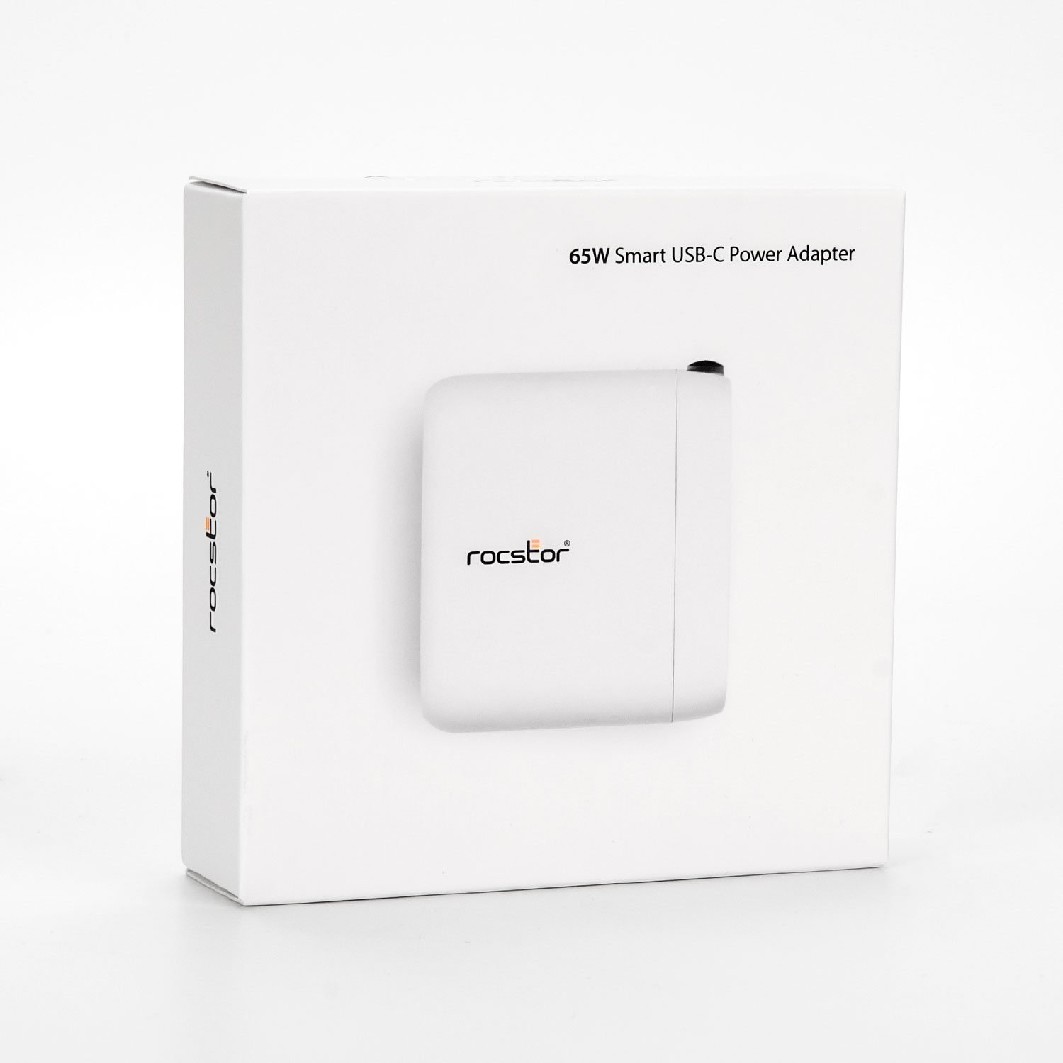 65W Smart USB-C® Power Adapter, Rocstor 65W Smart USB-C Power Adapter offers charging compatibility with numerous USB-C devices such as Apple® MacBook Air® 13” & MacBook Pro® 13” with 61W charging power requirement. This versatile smart power adapter can charge any HP®, Lenovo®, Dell and Chromebook™ devices that utilizes USB-C charging port with up to 65W power. Rocstor’s 65W Smart power adapter automatically adjusts to your device power requirement up to 65W. This travel and compact charger is rugged, light and it is able to charge laptops, tablets, cellular phones, earphones and everything else with a USB power input up to 65W. You are able to take advantage of this fast power adapter to charge your Apple® iPhone®, Samsung Galaxy®, or Google® Pixel® phones. The slim and compact design charger measures only 2.2” x 1.9” x 1.1” (56.2 x 50 x 28.7 mm) and features a foldable plug. The Rocstor 65W has the latest GaN (Gallium Nitride) Charging Technology and it holds the UL, FCC/CE certifications for the máximum safety protocols. It has a more efficient current transfer, which translates to less power loss to heat. Backed by Rocstor’s 1-year warranty and lifetime technical phone support.