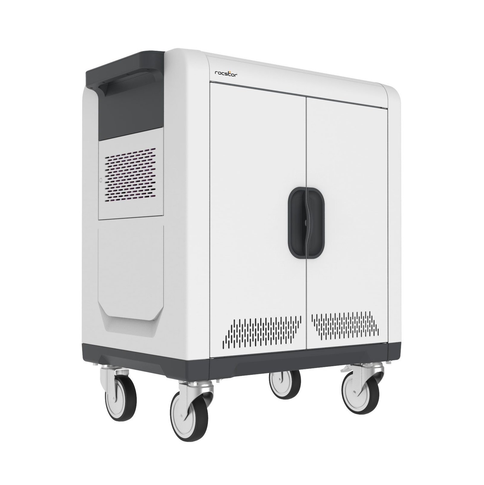 Rocstor Volt C24 features a compact design charging cart which Charges and Stores up to 24 devices such as Macbook®, Macbook® Air, Macbook® Pro, laptops, Chromebook®, & iPad®, and netbooks up to 15.6 inch diagonal screen size. This compact and durable cart with its dimensions of 36.5” H, 30.3” W, 21.7” D is ideal for classrooms or offices with limited space availability. This Locking steel cart provides AC charging, secure storage and exceptional cord management for education, government, offices, commercial, retail, industrial and healthcare sectors. This innovative cart has a large compartment with up to 24 individual, smooth edged shelves for easy, quick, and safe loading and unloading.
