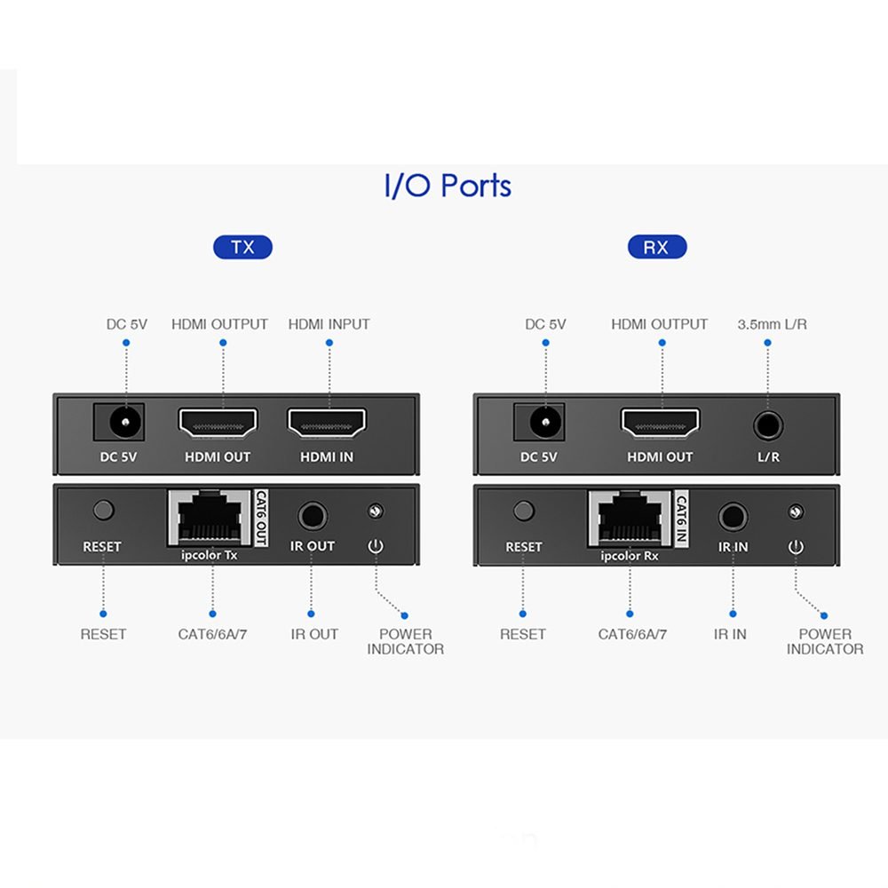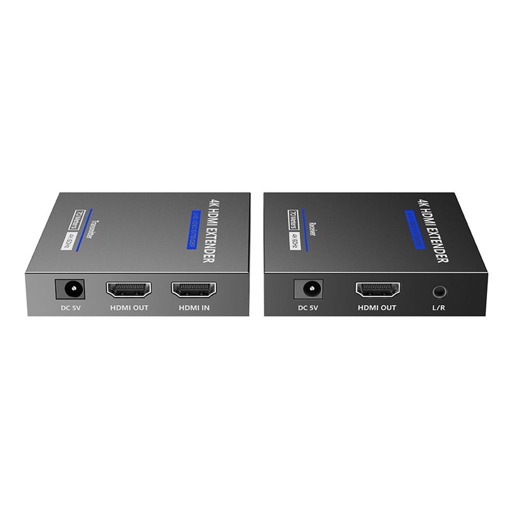 4K@60Hz HDMI Extender over CAT6/CAT6a/Cat7 Ethernet Cable – 4K 60Hz up to 230ft (70m) – Point to Point Extender – iPcolor Image – Zero Latency – 3.5mm Audio – Includes HDMI Transmitter and Receiver (Kit) – Supports IR pass-through – HDCP 2.2, EDID, HDR, YUV4:4:4 – HDMI 2.0 Extender over CAT6/CAT6a/Cat7 Ethernet – One UL power supply – No Software/drivers required – Metal housing Includes built-on mounting brackets – Black