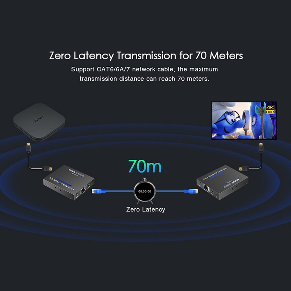 • Transmission distance of up to 131 ft (40 meters) for 4K @ 60Hz and 70 meters for 1080p @ 60Hz signals